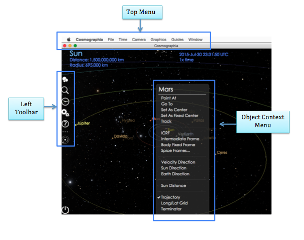 The top menu is the horizontal menu bar displayed at the very top of Cosmographia’s screen. In full screen mode, this bar may disappear when not used and reappear when the mouse cursor is hovered near the top of the screen.